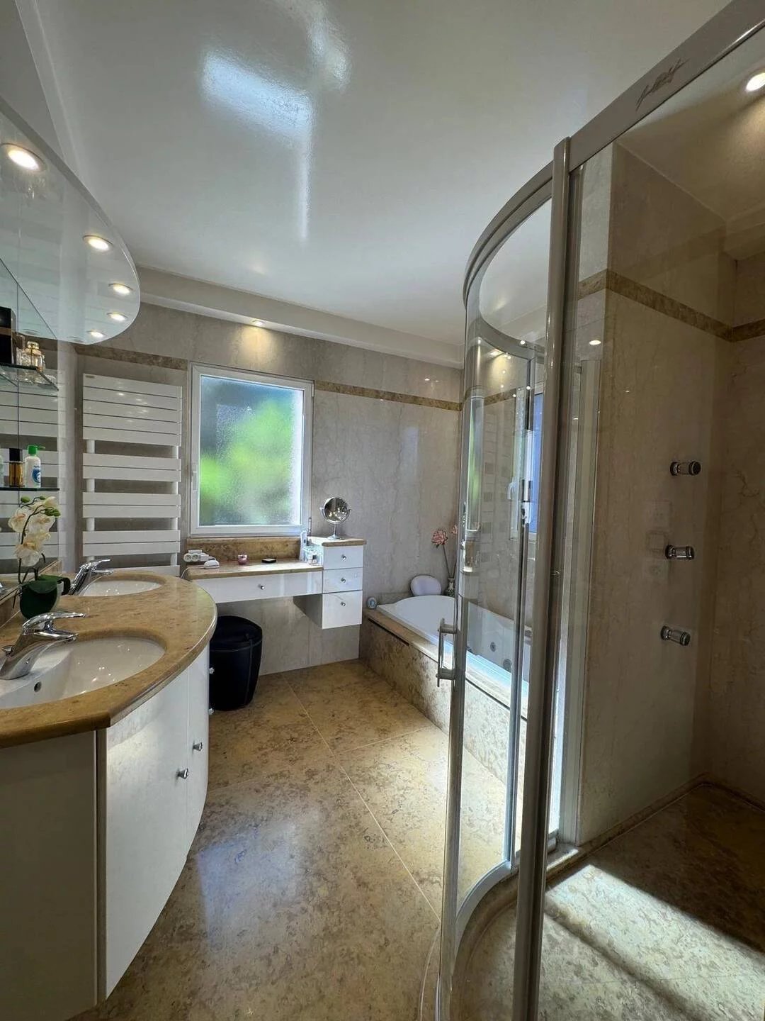 Les pièces de réception comprennent un salon de 31 m² avec cheminée centrale double face, une salle à manger de 17 m² et une cuisine haut de gamme sur mesure avec plan de travail en granit, prolongée par un espace dinatoire et des terrasses plein sud, face à la piscine. Une suite parentale complète ce niveau avec chambre parquetée, dressing et salle de bains en marbre avec baignoire balnéo et douche italienne.